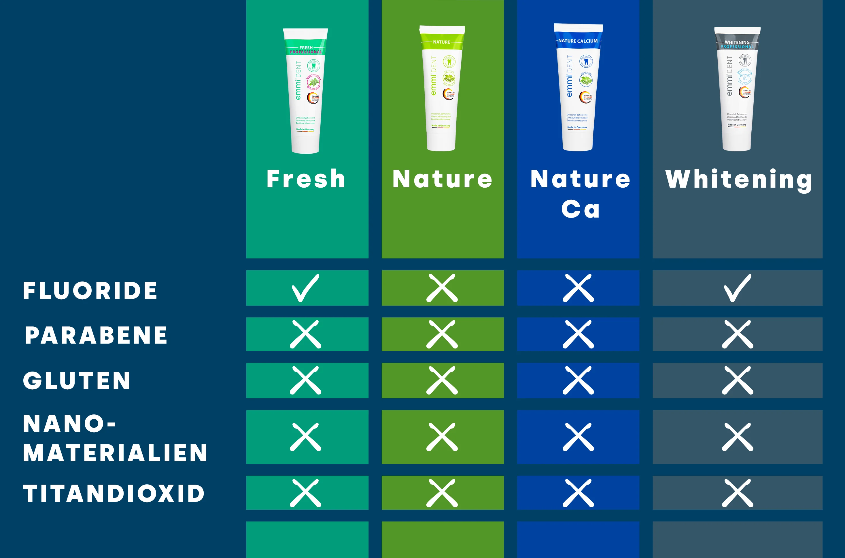 Beide Zahncremes sind das Ergebnis ausführlicher Tests und Forschungen und stehen für eine schonende, aber wirksame Zahnpflege. Überzeugen Sie sich von unserer Whitening Zahnpasta ohne Titandioxid oder unserer Fresh Zahnpasta ohne Titandioxid und erleben Sie strahlende, gesunde Zähne.