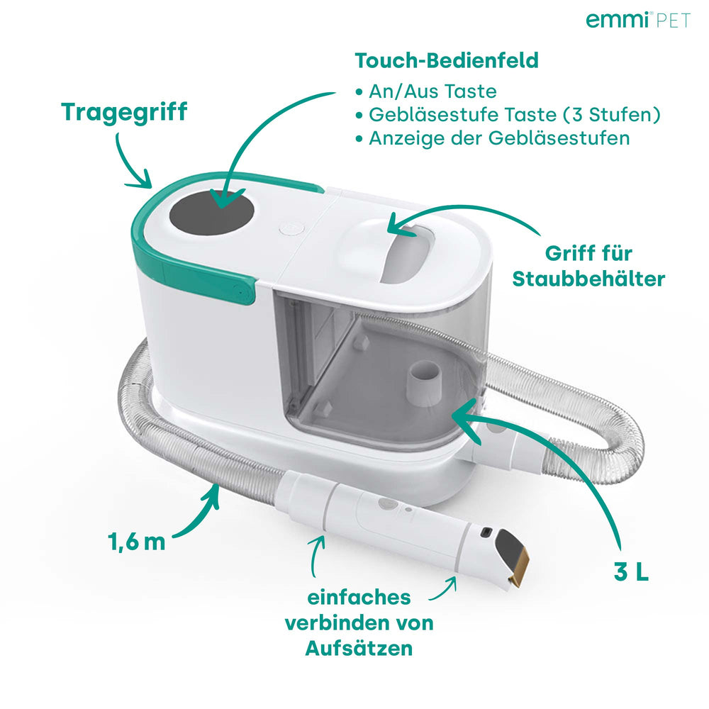 Ein sauberes Zuhause zu bewahren kann für Haustierbesitzer eine Herausforderung sein. Tierhaare auf Teppichen, Möbeln und Hartböden sind allgegenwärtig. Die Lösung? Das emmi-pet Grooming Kit vereint Schermaschine, Kamm und Tierhaarstaubsauger in einem Gerät – ein beutelloser Staubsauger mit Schermaschine, der speziell für die Anforderungen von Hund und Katze entwickelt wurde, um Tierhaare effizient zu entfernen, zu schneiden und Gerüche zu minimieren.