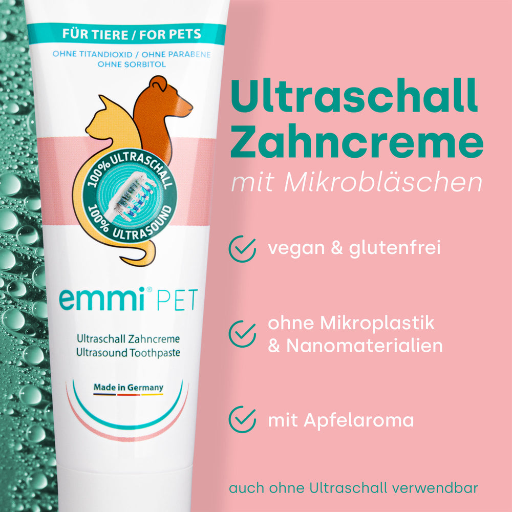 Die Zahnpflege ist ein wesentlicher Bestandteil der Gesundheit und des Wohlbefindens deines Hundes. Mit der emmi-pet Ultraschall Zahnpasta für Tiere und der dazugehörigen Ultraschallzahnbürste bieten wir eine revolutionäre Lösung zur Zahnreinigung und Mundhygiene, die speziell auf die Bedürfnisse von Hunden und Katzen abgestimmt ist.