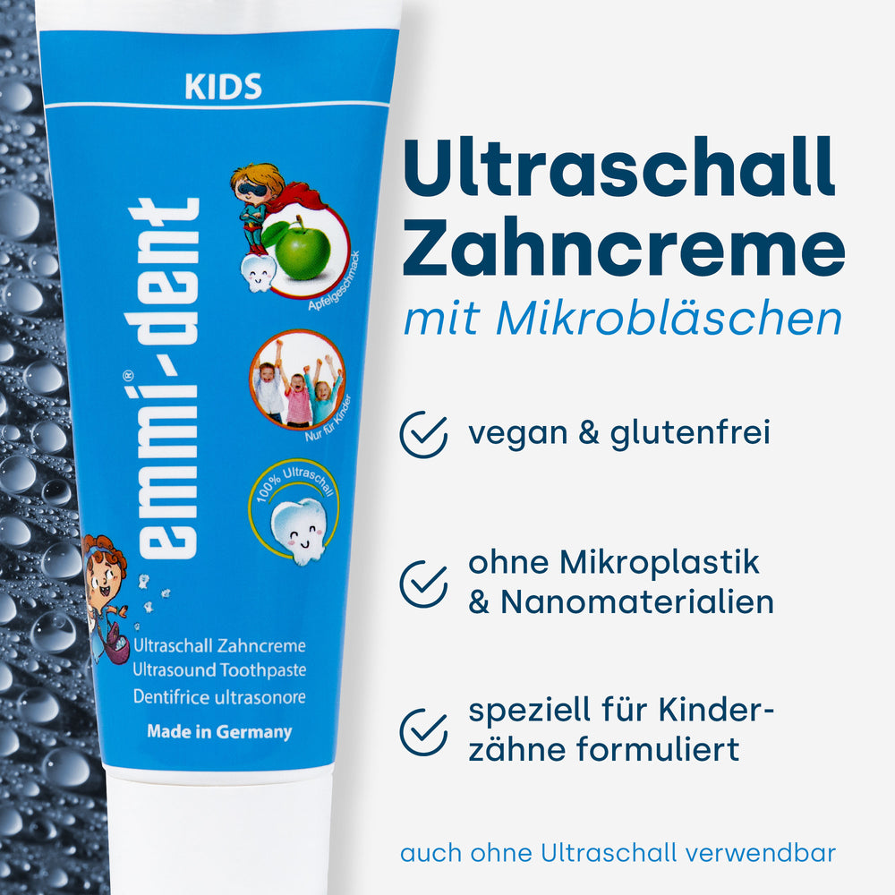 Lassen Sie Ihre Kinder das beste Zähneputzen erleben - mit emmi-dent Kids Ultraschall Zahnpasta, die speziell für ihre Bedürfnisse entwickelt wurde. Bestellen Sie noch heute und schenken Sie Ihren Kindern das Lächeln, das sie verdienen.