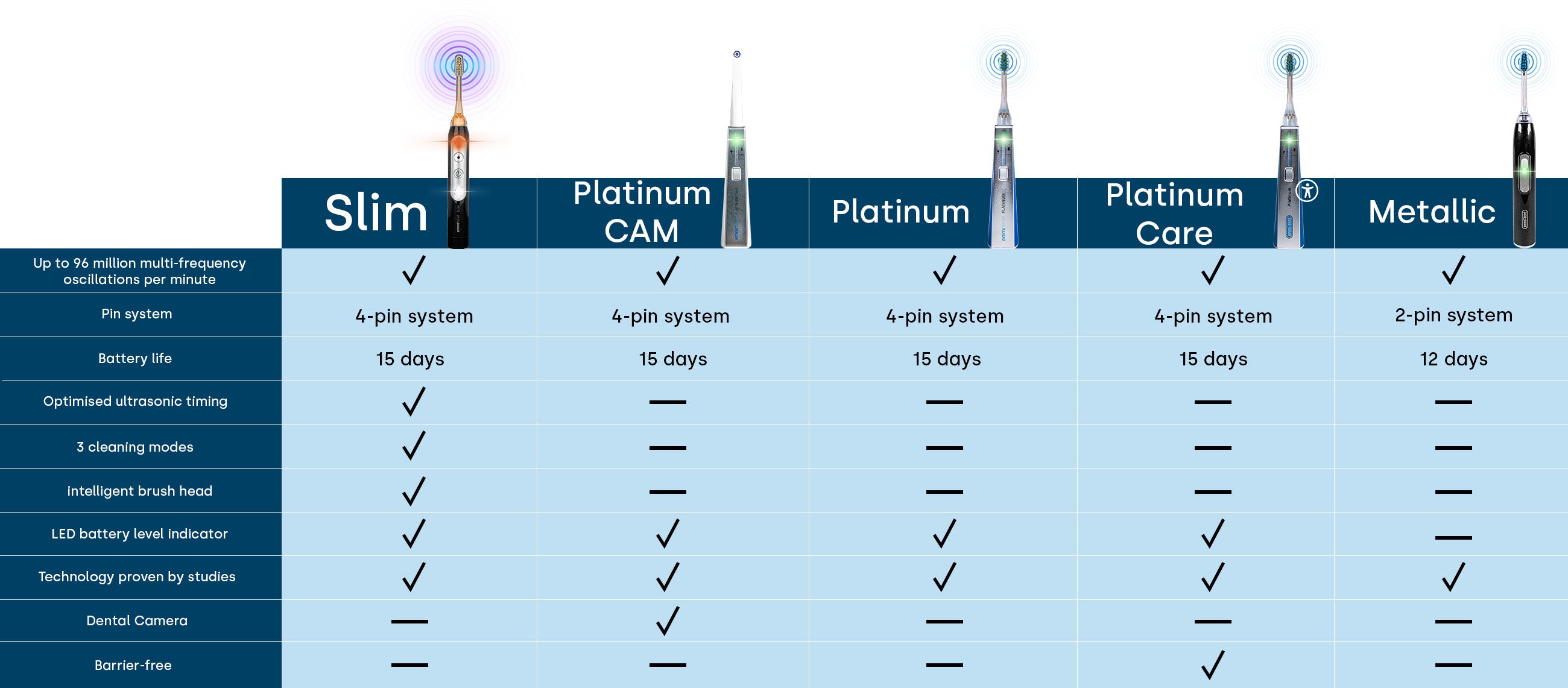 El modelo Platinum supera a los modelos Metallic en términos de efectividad. También aquí los usuarios de todas las edades se benefician de la tecnología avanzada. Con un sistema de 4 pines y una duración de batería de 15 días, el modelo Platinum representa lo máximo en cuidado dental ultrasónico.