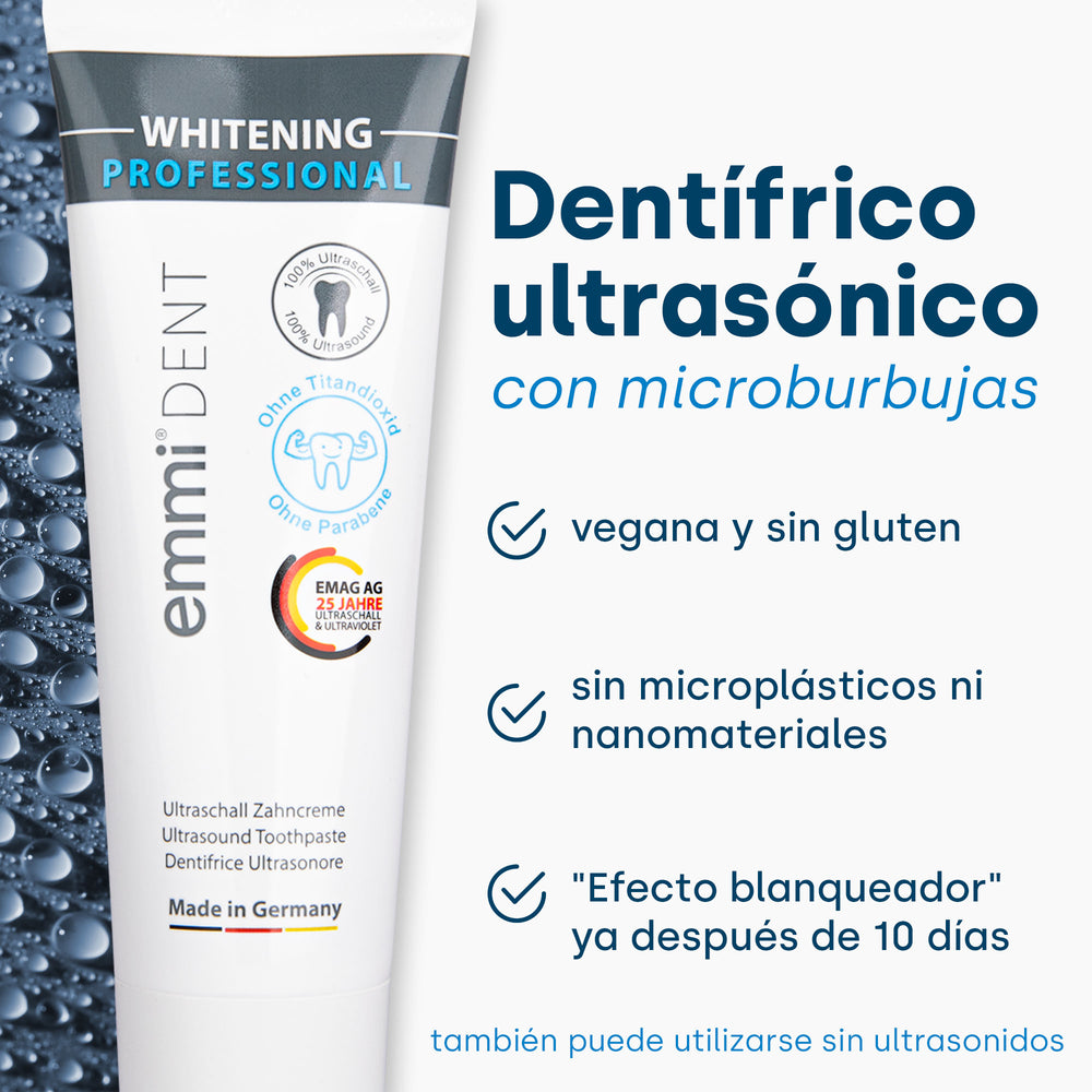 En comparación con los cepillos de dientes eléctricos convencionales, el cepillo de dientes ultrasónico emmi-dent Platinum ofrece una limpieza profunda y eficaz mediante el uso de ondas ultrasónicas para reducir las bacterias y la placa. El cepillo de dientes ultrasónico emmi-dent Platinum está especialmente recomendado para personas que necesitan y prefieren una limpieza especialmente profunda, por ejemplo en casos de gingivitis, periodontitis u otras enfermedades dentales. Gracias al uso de tecnología ultrasónica, las vibraciones penetran profundamente en los espacios entre los dientes para limpiar incluso las zonas de difícil acceso y así prevenir eficazmente la caries, la placa y las enfermedades de las encías. La estructura de las microburbujas, que se enriquecen en un paso de producción adicional en las pastas dentales ultrasónicas emmi-dent, se destruye por las ondas ultrasónicas y colapsan en los espacios entre los dientes y debajo de la línea de las encías, creando así un efecto de succión para disolver o reducir la placa y las bacterias. La pasta de dientes, desarrollada especialmente para su uso con emmi-dent Platinum, contiene microburbujas que se activan con las ondas ultrasónicas del cepillo de dientes y permiten una limpieza aún más profunda. La existencia de las microburbujas fue confirmada por la Universidad Goethe de Frankfurt am Main. El emmi-dent Platinum es especialmente adecuado para personas con dientes sensibles, personas con implantes, personas que usan aparatos de ortodoncia y personas con gingivitis, ya que la tecnología de ultrasonidos es suave con los dientes y las encías. El emmi-dent Platinum presenta un diseño platino exclusivo e incluye cabezales de cepillo ultrasónicos especiales (se pueden pedir por separado) que han sido desarrollados específicamente para su uso con tecnología ultrasónica. Estos cabezales de cepillo son especialmente suaves con los dientes y las encías y garantizan una limpieza suave pero exhaustiva. Ya tenga dientes rectos (M2), dientes desiguales (M2 Wave), use aparatos de ortodoncia (PM2) o sea un niño o una persona con mandíbulas pequeñas (S2), emmi-dent tiene los cabezales de cepillo adecuados.