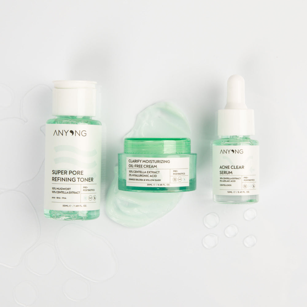Le kit idéal contre les peaux impures. Le tonique affinant les pores élimine l'excès de sébum, ce qui en fait un préliminaire idéal. Le produit phare pour une peau nette est le sérum Acne Clear, qui contient de l'extrait de cantella et de l'acide azélaïque. Il réagit spécifiquement à vos problèmes de peau et régénère votre peau. L'hydratant sans huile et clarifiant offre une finition douillette.
