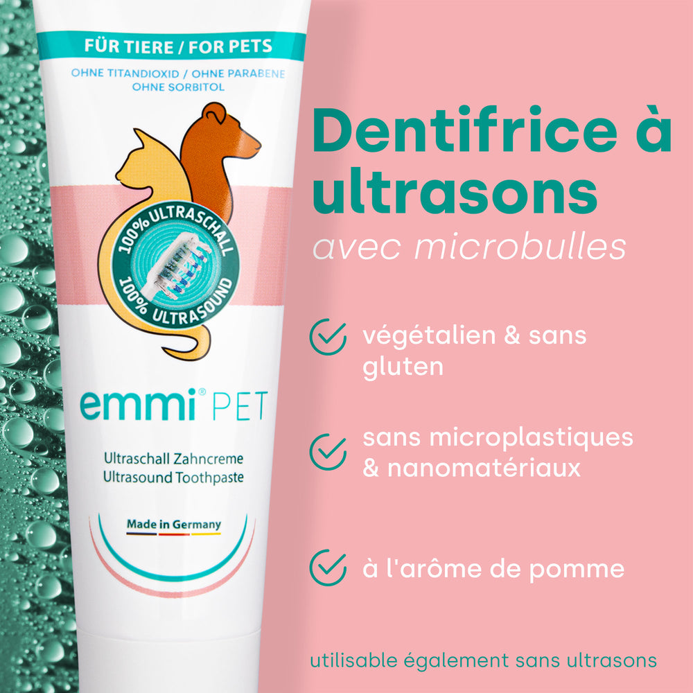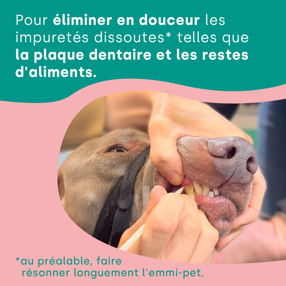 L'emmi-pet 2.0 est basé sur une technologie ultrasonique brevetée (jusqu'à 96 millions de vibrations ultrasoniques par minute) et, lorsqu'il est utilisé régulièrement, prévient efficacement le tartre et réduit la plaque dentaire. Une utilisation régulière prévient non seulement la formation de plaque dentaire, mais masse et renforce également les gencives et réduit l'inflammation des gencives existante.
