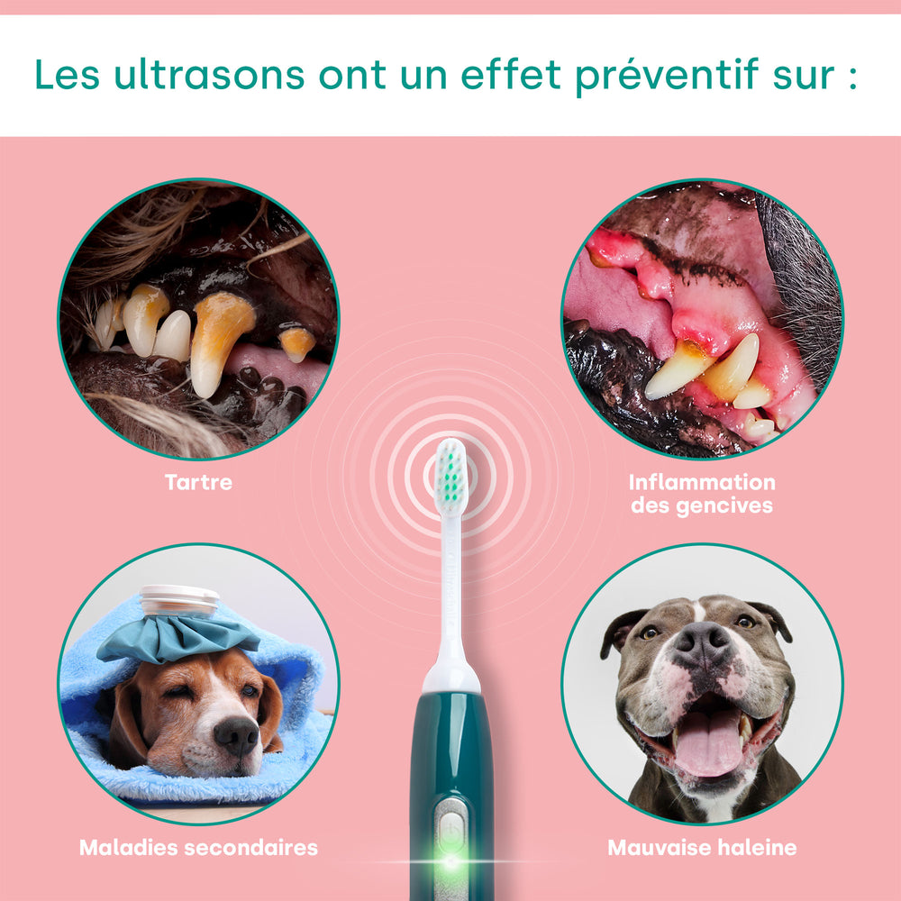 La brosse à dents à ultrasons emmi-pet utilise une technologie ultrasonique 100 % brevetée, qui assure un nettoyage en profondeur avec jusqu'à 96 millions de vibrations ultrasoniques par minute, sans aucun frottement. Grâce à son fonctionnement silencieux et sans vibrations, il offre une expérience de nettoyage respectueuse de l'animal et sans stress pour votre animal de compagnie !