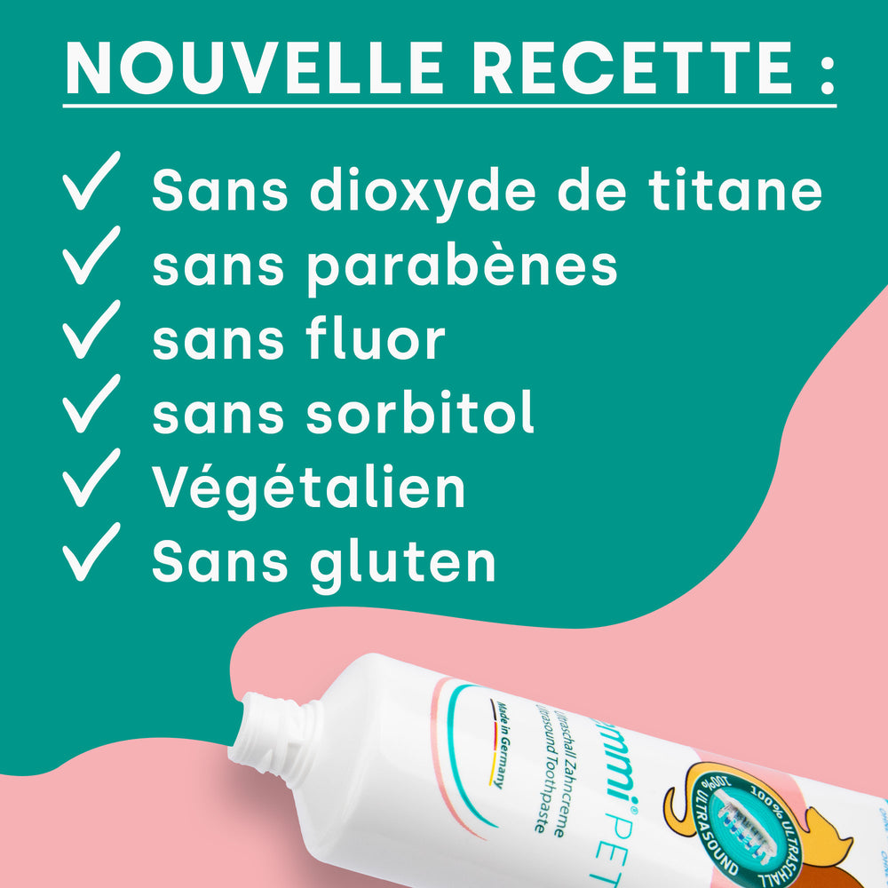 Notre dernière formule est totalement exempte de dioxyde de titane, de sorbitol, de fluorure et de parabènes. Au lieu de cela, nous nous appuyons sur des ingrédients naturels qui sont combinés dans un processus de production moderne pour maximiser la tolérance et créer un produit naturel. Ceci est particulièrement important pour les animaux de compagnie sensibles à certains produits chimiques.