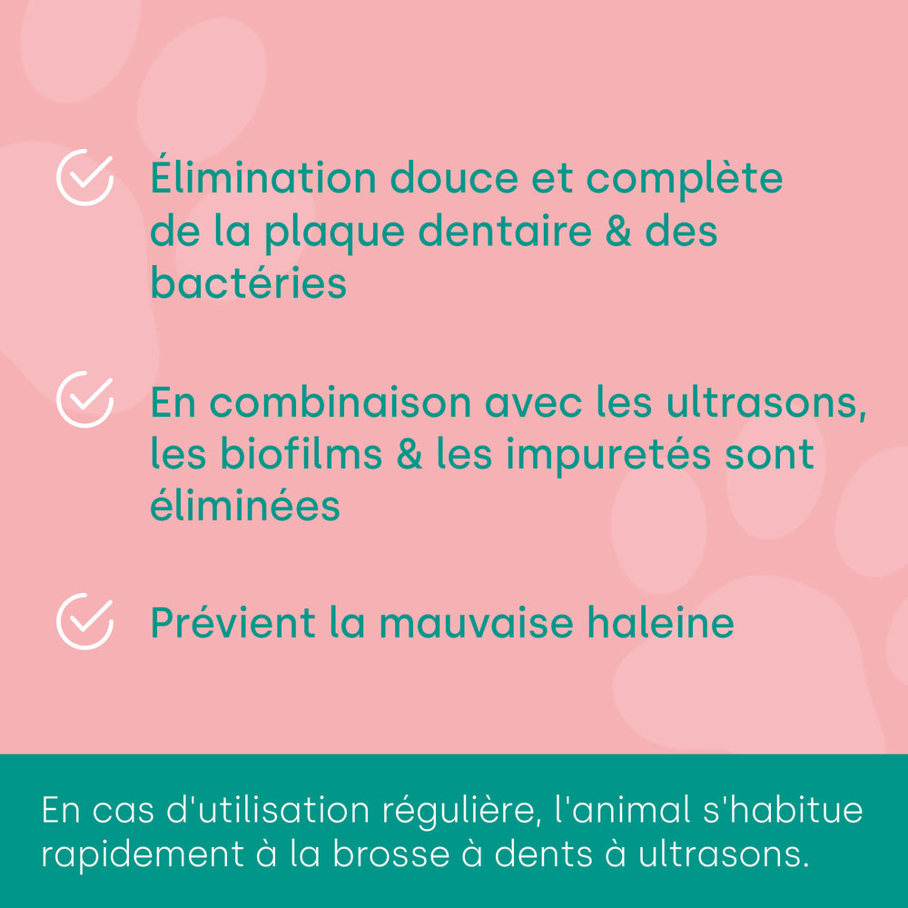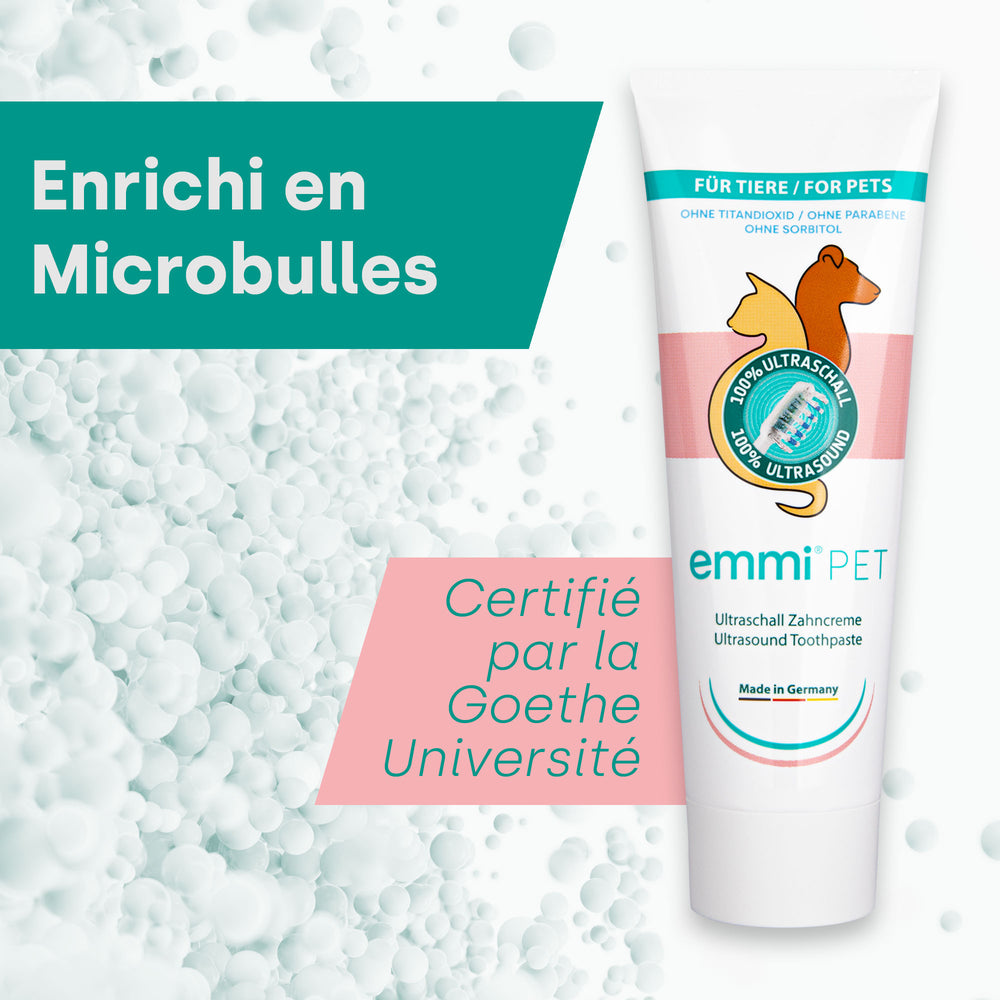 Le dentifrice à ultrasons pour animaux emmi-pet offre de nombreux avantages qui en font un excellent choix pour les soins dentaires de votre animal : Nettoyage doux sans abrasion : Grâce aux ultrasons, il n’est pas nécessaire de procéder à un brossage abrasif des dents. La valeur RDA (abrasion relative de la dentine) est de 0, ce qui signifie que le dentifrice est particulièrement doux pour l'émail et les gencives de votre animal. Élimination efficace des biofilms et des bactéries : la technologie des microbulles garantit que même la plaque dentaire et les bactéries tenaces sont éliminées sans exercer de contrainte mécanique sur les dents. Prévention des maladies des dents et des gencives : Un nettoyage doux mais approfondi préserve les fonctions protectrices naturelles des dents, réduisant ainsi considérablement le risque de maladies des dents et des gencives. Lutte contre la mauvaise haleine : L’utilisation régulière du dentifrice emmi-pet aide à prévenir la mauvaise haleine en réduisant le nombre de bactéries responsables des odeurs.