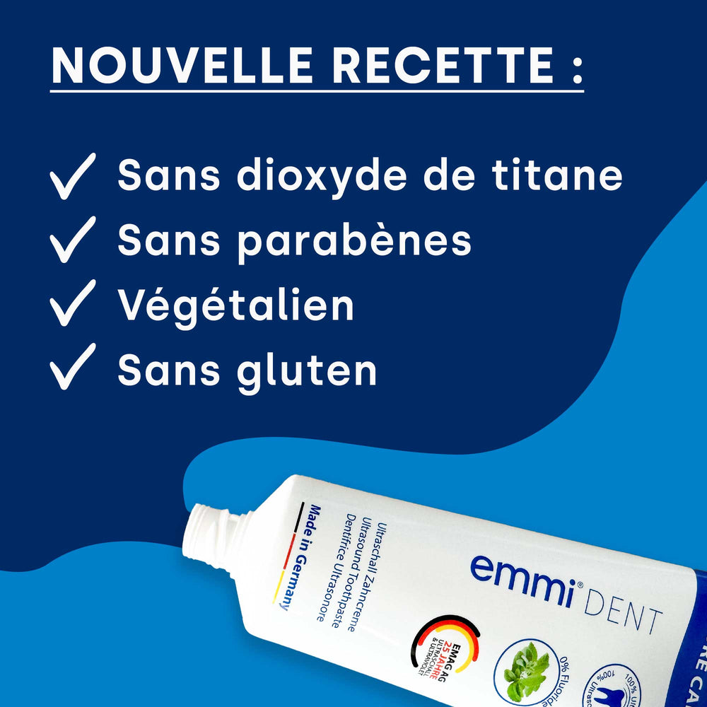 Le dentifrice ultrasonique emmi-dent Nature Calcium contient du calcium de haute qualité qui renforce vos dents et reminéralise l'émail des dents. En renforçant l’émail, vos dents deviennent plus résistantes aux attaques acides et à la carie dentaire. Faites confiance à emmi-dent et offrez à vos dents le renforcement naturel qu’elles méritent.
