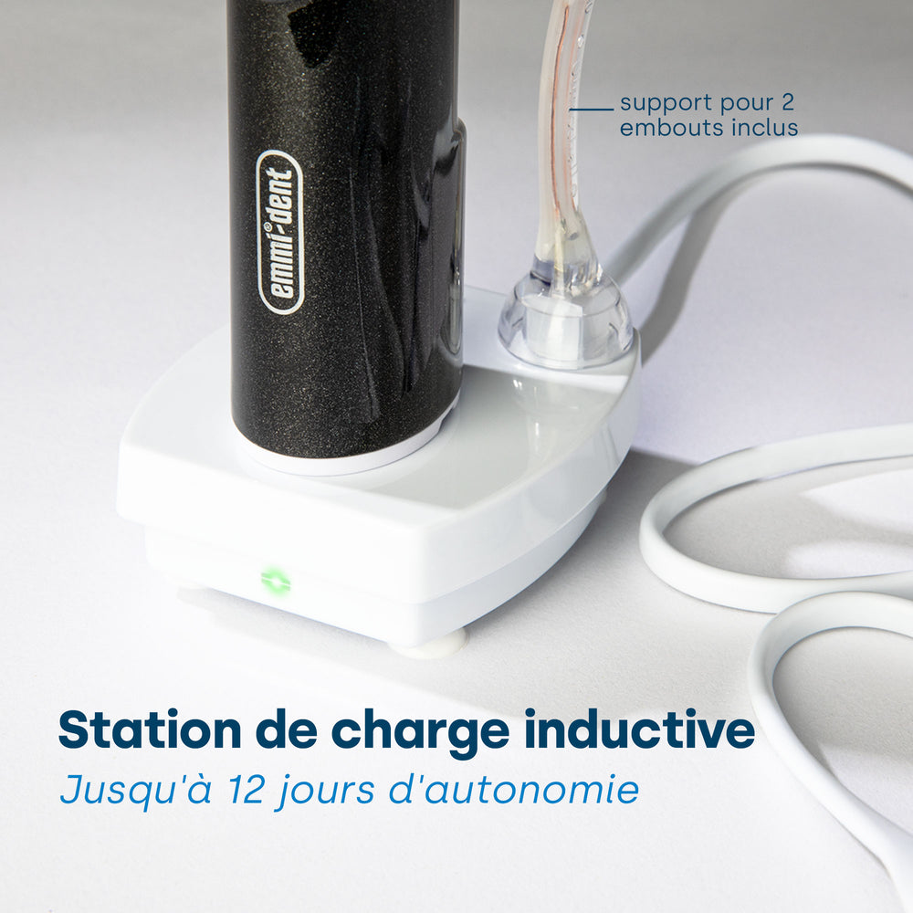 L'emmi-dent Metallic dispose d'une autonomie de batterie optimale. Avec une utilisation régulière 2 à 3 fois par jour, le Metallic peut durer jusqu'à 12 jours avant de devoir être rechargé. Cette durée de vie prolongée de la batterie (lithium-ion) offre commodité et utilisation ininterrompue et élimine le besoin de charges fréquentes.