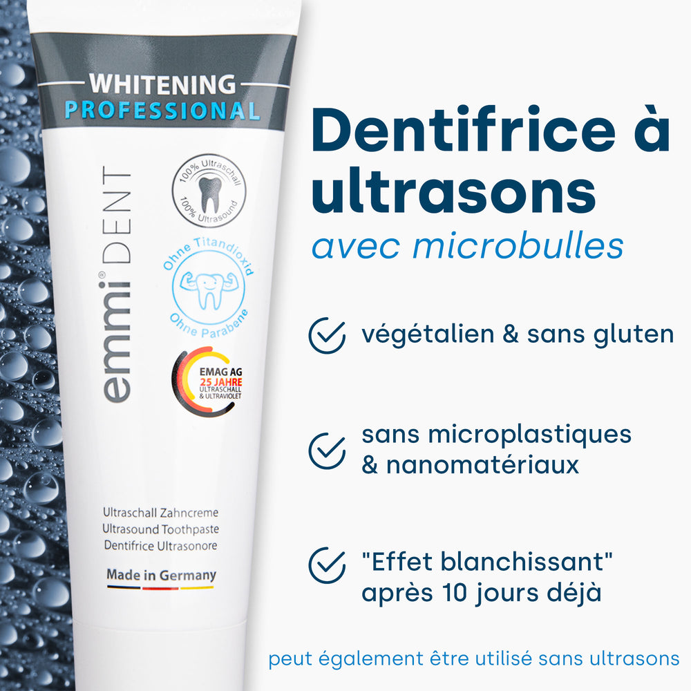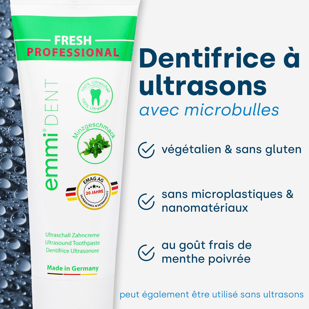 L'emmi-dent Metallic utilise un dentifrice ultrasonique spécial qui contient les microbulles nécessaires, qui sont environ 1000 fois plus petites que les bulles de dentifrice classiques. Ces microbulles sont ajoutées lors d’une étape supplémentaire du processus de production pour garantir une expérience de nettoyage optimale – retrouvez l’étude sur leur existence ici. Considérez les cinq différentes options de dentifrice disponibles pour emmi-dent et leurs avantages et caractéristiques respectifs.