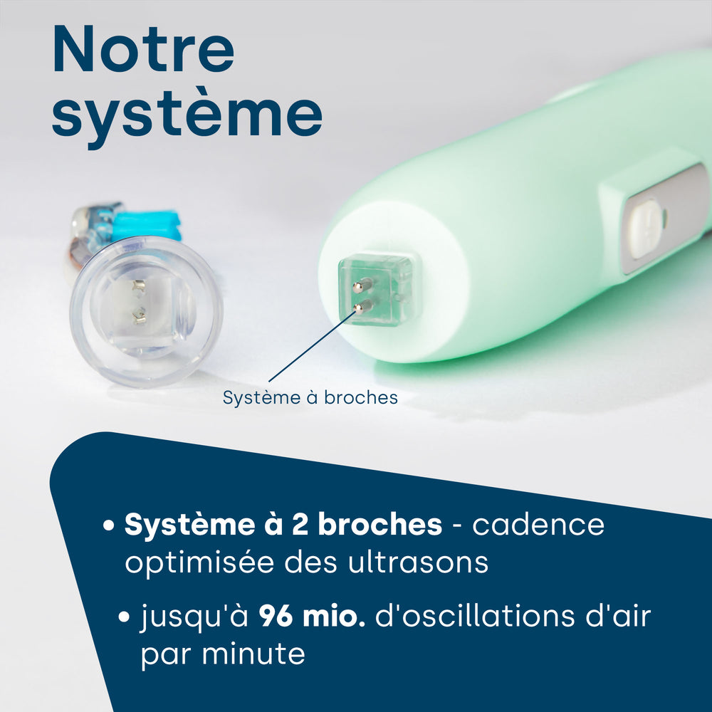 Les ultrasons réduisent les bactéries, même dans les poches des gencives, réduisent la mauvaise haleine et atteignent également les endroits difficiles d'accès : espaces interdentaires, réduction des bactéries, pour les porteurs d'appareils orthodontiques, d'implants, etc....