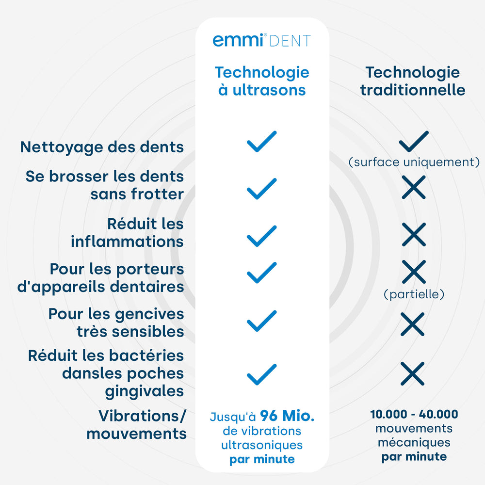 Les brosses à dents électriques comprennent les brosses à dents rotatives, les brosses à dents soniques et les brosses à dents à ultrasons. Alors que les premières ont généralement des brosses rondes qui tournent alternativement de gauche à droite, les brosses à dents soniques sont équipées de têtes allongées et vibrantes. Avec 20 000 à 40 000 vibrations par minute, elles atteignent des mouvements mécaniques nettement supérieurs à ceux des brosses rotatives. Le brossage des dents à ultrasons est une technologie complètement différente. Alors que les brosses à dents rotatives et soniques éliminent le biofilm à l'aide de mouvements mécaniques, l'emmi-dent Platinum Care fonctionne avec jusqu'à 96 millions de vibrations ultrasoniques par minute et ne nécessite aucun mouvement mécanique pour le nettoyage des dents. Nettoyage des dents sans mouvement grâce à la dernière technologie à ultrasons ou brossage des dents sans frotter.