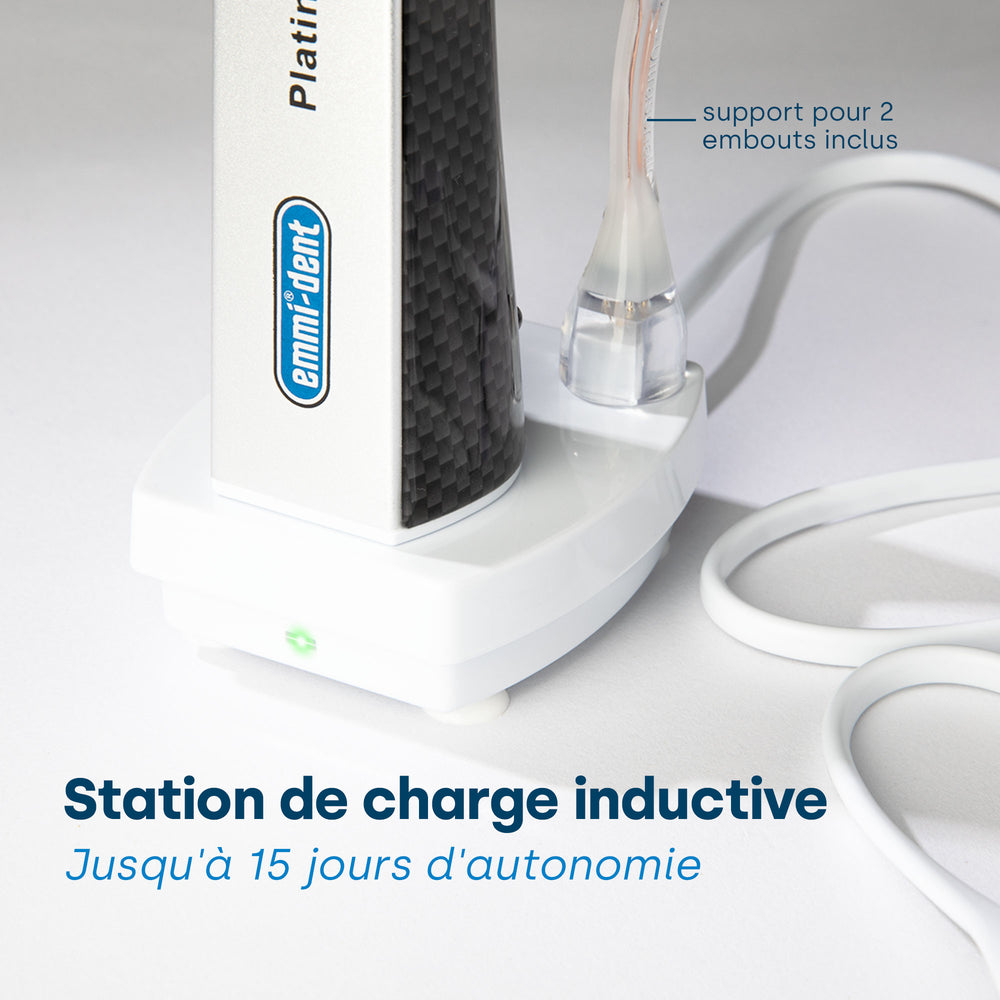 Les brosses à dents à ultrasons sont le summum de l’innovation en matière de soins dentaires, offrant des performances de nettoyage qui vont bien au-delà de ce qui est possible avec les brosses à dents électriques traditionnelles. Lorsque vous choisissez la meilleure brosse à dents à ultrasons, vous devez prêter attention aux facteurs qui affectent à la fois l’efficacité du nettoyage et la facilité d’utilisation. Notre brosse à dents à ultrasons emmi-dent Platinum est à la pointe de cette révolution technologique et répond à tous les critères d'une excellente brosse à dents à ultrasons : 100% ultrasonique : Contrairement aux brosses à dents soniques, qui sont basées sur des mouvements mécaniques, notre emmi-dent Platinum fonctionne avec des vibrations ultrasoniques pures - jusqu'à 96 millions de vibrations par minute. Cette haute fréquence permet un nettoyage en profondeur sans contact mécanique, minimisant ainsi le risque de blessure et offrant des résultats de nettoyage inégalés. Vibration désactivable : L'emmi-dent Platinum offre la possibilité de désactiver la vibration. Cela garantit un soin sur mesure, que ce soit pour les gencives sensibles ou pour une élimination intensive de la plaque dentaire – le tout sans frottement ni vibration ! Longue durée de vie de la batterie : avec une autonomie allant jusqu'à 15 jours lorsqu'elle est utilisée deux fois par jour, notre brosse à dents à ultrasons établit de nouvelles normes en termes d'endurance et élimine le besoin de charge fréquente. Fabrication de haute qualité : l'emmi-dent Platinum se caractérise par un moteur puissant et un boîtier étanche, qui garantit une utilisation durable et fiable. Têtes de brosse diverses : Pour correspondre à notre brosse à dents à ultrasons, nous proposons une sélection de têtes de brosse conçues pour différentes applications et besoins des utilisateurs afin de permettre un nettoyage individuel et efficace. L'emmi-dent Platinum se distingue des autres brosses à dents à ultrasons par sa technologie avancée et son orientation utilisateur. Alors si vous recherchez la meilleure brosse à dents à ultrasons, l'emmi-dent Platinum vous offre une combinaison de nettoyage efficace, de confort et de technologie avancée qui garantit des performances de nettoyage et une hygiène bucco-dentaire maximales lors du brossage des dents !