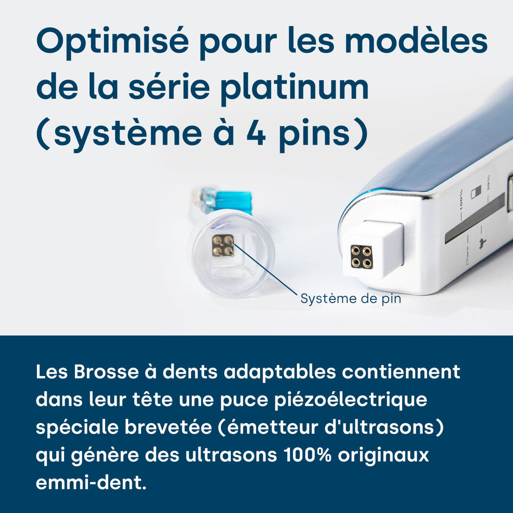 La technologie des ultrasons révolutionne la façon dont vous nettoyez et prenez soin de vos dents. L'emmi-dent Platinum est la première génération de brosses à dents à ultrasons emmi-dent avec un système à 4 broches. Cela signifie que l'emmi-dent Platinum génère jusqu'à 4 impulsions ultrasonores par seconde.