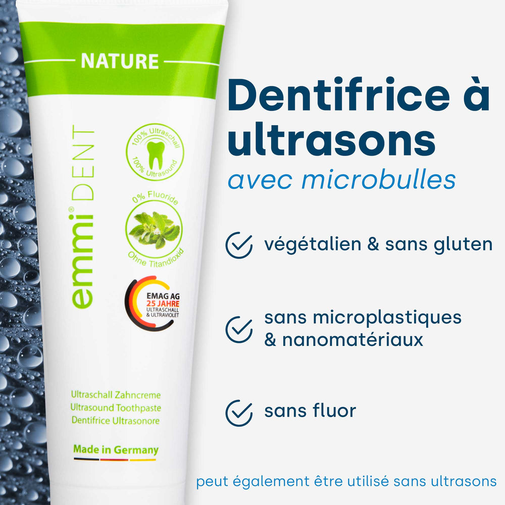 Les ondes ultrasoniques pénètrent profondément dans les espaces entre les dents et la ligne des gencives, dissolvant efficacement les bactéries et la plaque. Cela aide à prévenir la carie dentaire, la gingivite et d’autres maladies dentaires. Pour des résultats encore plus approfondis, le dentifrice à ultrasons emmi-dent spécialement développé est utilisé. Les microbulles contenues renforcent l'effet de la technologie à ultrasons et assurent ainsi un nettoyage et un soin bucco-dentaire encore plus efficaces.