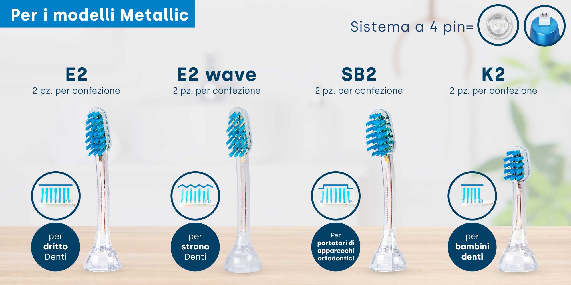 Per i modelli Platinum sono necessarie le nostre testine a 4 pin, come i modelli M2, M2 Wave, S2 e PM2. Gli utenti dei modelli Metallic , GO o Professional dovrebbero scegliere le testine a 2 pin come E2, E2 Wave, SB2 o K2.