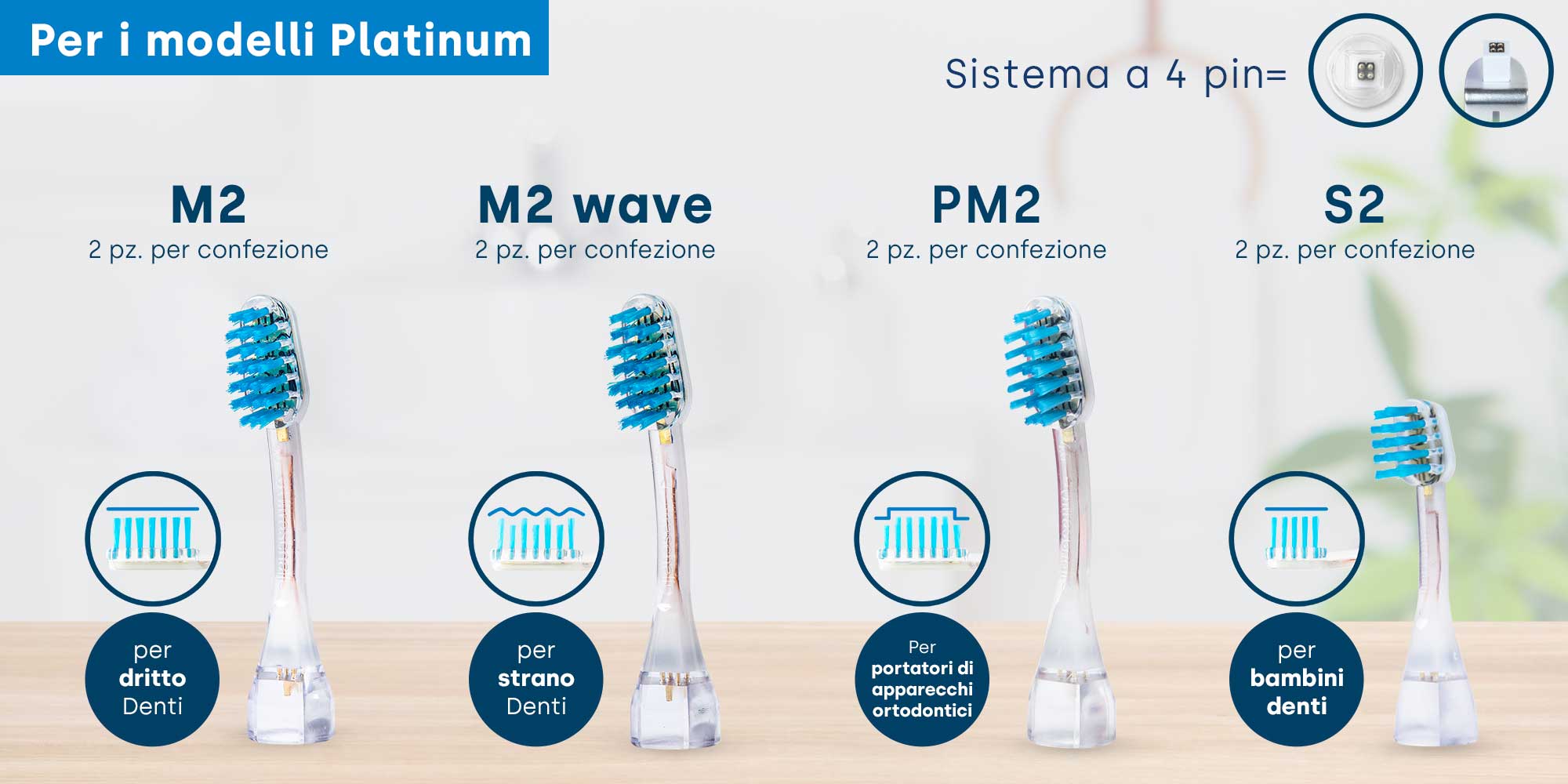 Le testine M2 e M4 Platinum sono considerate le testine standard per gli spazzolini elettrici a ultrasuoni, dotati di ultrasuoni originali al 100%. Le testine M2 Wave sono dotate di setole dal design innovativo che consentono una pulizia efficace e una migliore igiene orale per le persone con denti irregolari. Le diverse lunghezze delle setole facilitano la rimozione del biofilm e della placca e garantiscono risultati eccellenti anche in caso di discromie e depositi negli spazi tra i denti.