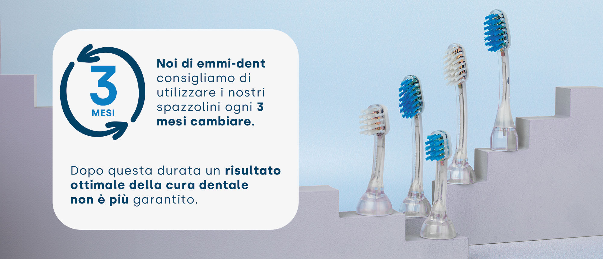 La durata delle testine emmi-dent è di circa tre mesi, poiché l'uso quotidiano riduce la capacità delle setole di trasmettere efficacemente gli ultrasuoni ai denti. Per continuare a garantire la migliore pulizia dei denti e l'igiene orale, si consiglia di cambiare regolarmente le testine dello spazzolino. Ciò garantisce prestazioni costantemente elevate dello spazzolino a ultrasuoni e protegge la salute della tua bocca.