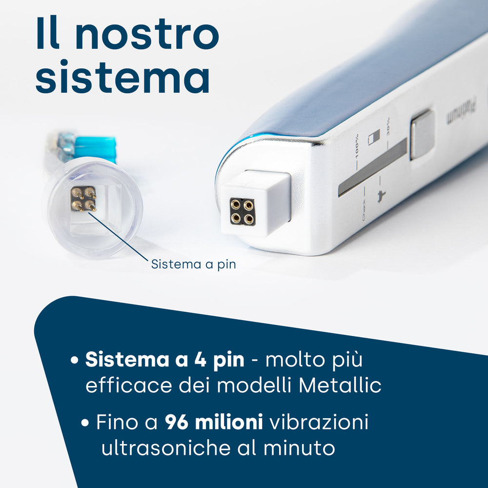 emmi-dent Platinum utilizza la tecnologia avanzata a 4 pin che funziona con quattro impulsi al secondo. Il risultato è una pulizia molto più efficace rispetto agli spazzolini tradizionali, generando fino a 96 milioni di vibrazioni ultrasoniche al minuto. Questa tecnologia garantisce una pulizia profonda che può addirittura ridurre l'infiammazione della bocca, un risultato confermato dagli studi.
