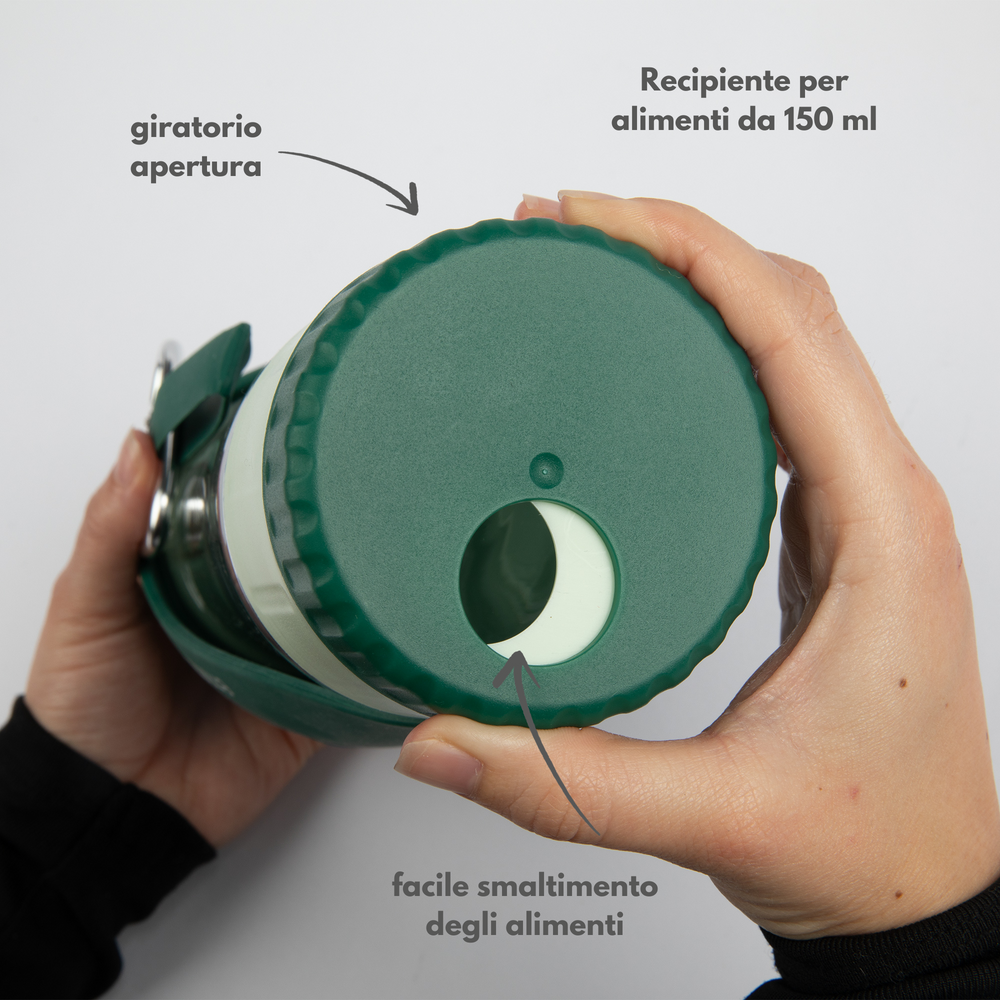 - Contenitore per snack integrato: 150 ml extra per cibo o snack, perfetto per piccole ricompense da portare con sé.