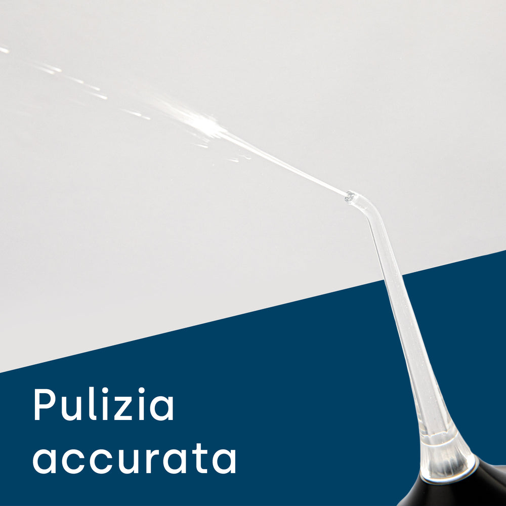 Cos'è esattamente un irrigatore orale e come funziona? Un irrigatore orale è un dispositivo elettronico che utilizza un getto d'acqua mirato per rimuovere le particelle presenti tra i denti. A differenza del filo interdentale, che può danneggiare le gengive se usato in modo improprio, l'idropulsore consente una pulizia delicata, anche nelle zone sensibili difficili da raggiungere. Anche l'uso del filo interdentale può essere percepito come sgradevole, mentre l'idropulsore è un'alternativa semplice e igienica. Completa in modo ottimale la cura orale quotidiana e aiuta efficacemente a rimuovere i depositi, prevenendo così la formazione della placca.