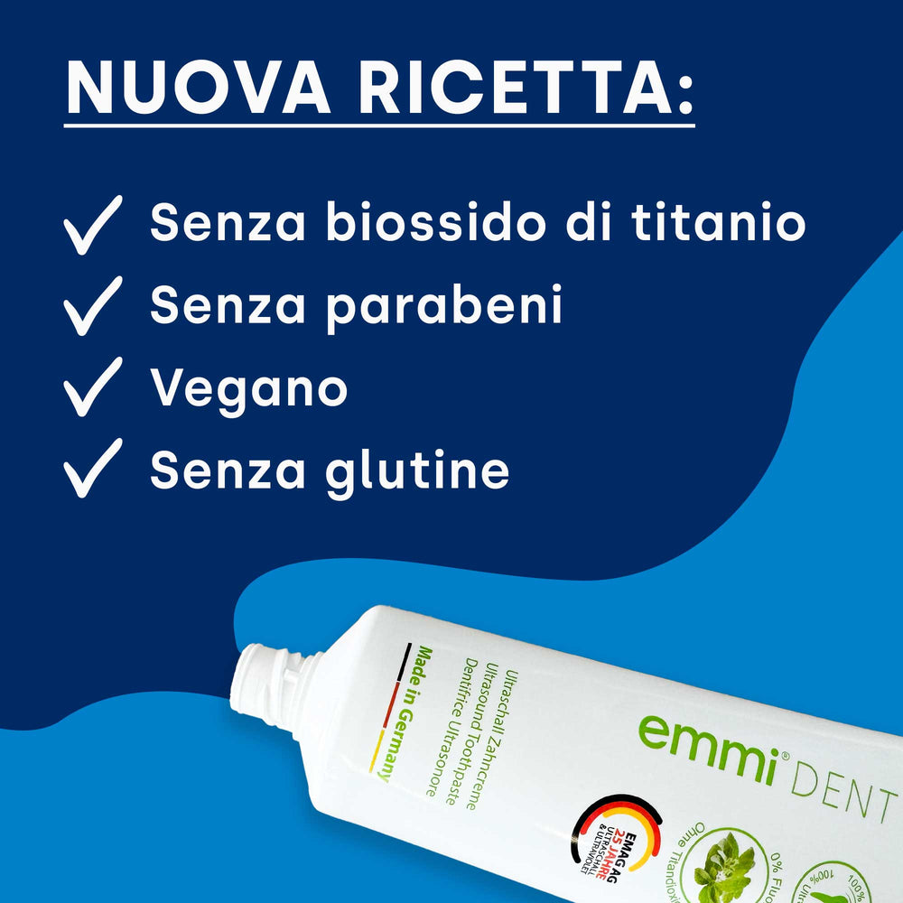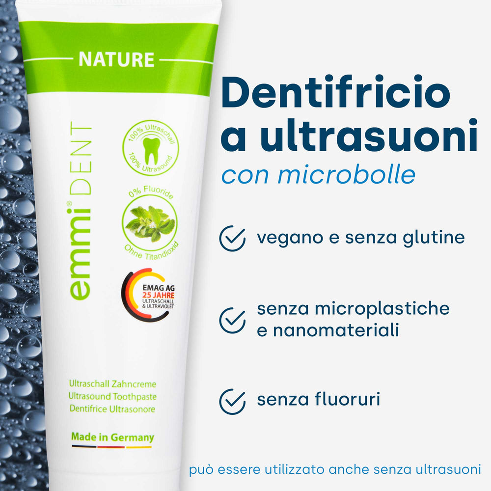 Scopri un'igiene dentale naturale e senza fluoro con il dentifricio emmi-dent Nature Ultrasonic, che valorizza il tuo sorriso radioso in un modo completamente nuovo. Il nostro innovativo dentifricio senza biossido di titanio combina ingredienti naturali con la moderna tecnologia a ultrasuoni per garantire una pulizia profonda. Il gel di silice lucida delicatamente i denti, mentre il sorbitolo li idrata. Goditi una cura delicata che pulisce i tuoi denti e fa brillare il tuo sorriso.