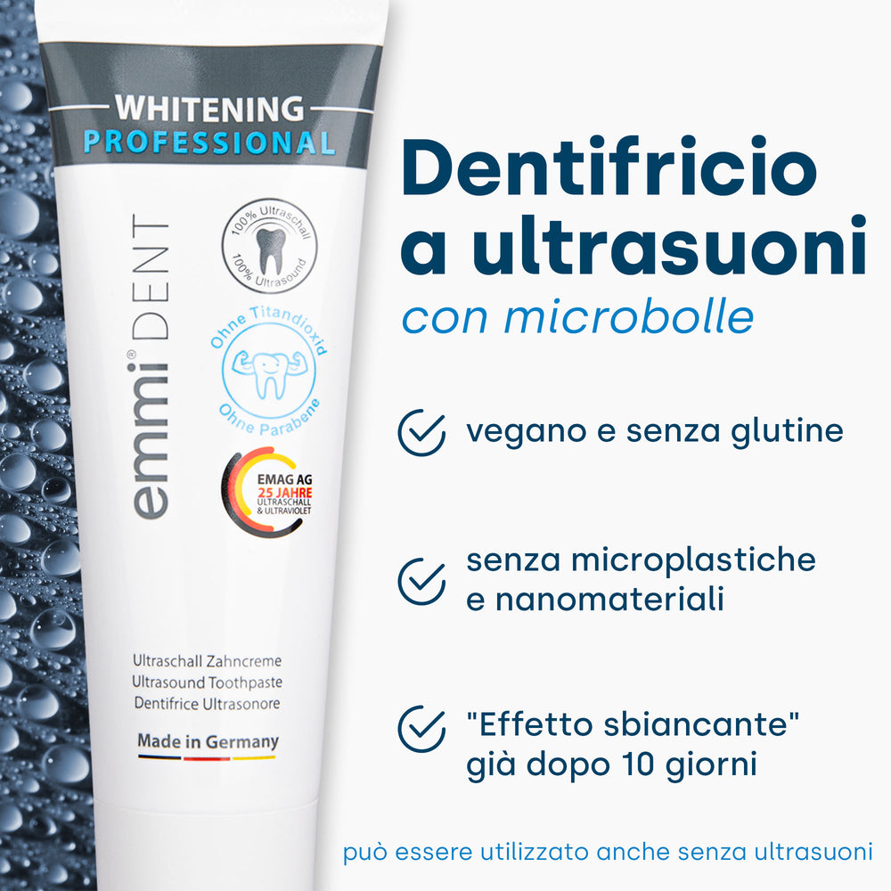 Inoltre, gli ultrasuoni hanno un effetto cosmetico: le macchie causate da vino, nicotina o cibi particolari vengono gradualmente schiarite, e in modo particolarmente delicato. È possibile intensificare questo effetto utilizzando in aggiunta il dentifricio sbiancante a ultrasuoni Emmi-Dent. Si prega di notare che non si dovrebbero mai usare esclusivamente dentifrici sbiancanti. Si consiglia di utilizzare dentifrici sbiancanti 2-3 volte alla settimana come dentifricio aggiuntivo. Questo vale per tutti i dentifrici sbiancanti.