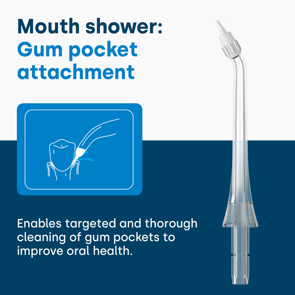 Suitable for periodontal pocket cleaning, injected in specific areas below the gum space. The pulse water column penetrates deep into the periodontal pocket/subgingival area. The fine soft nozzle can remove the harmful bacteria in the periodontal pocket/6-7mm below the gum. The pulsating water flow massages the gums pleasantly.