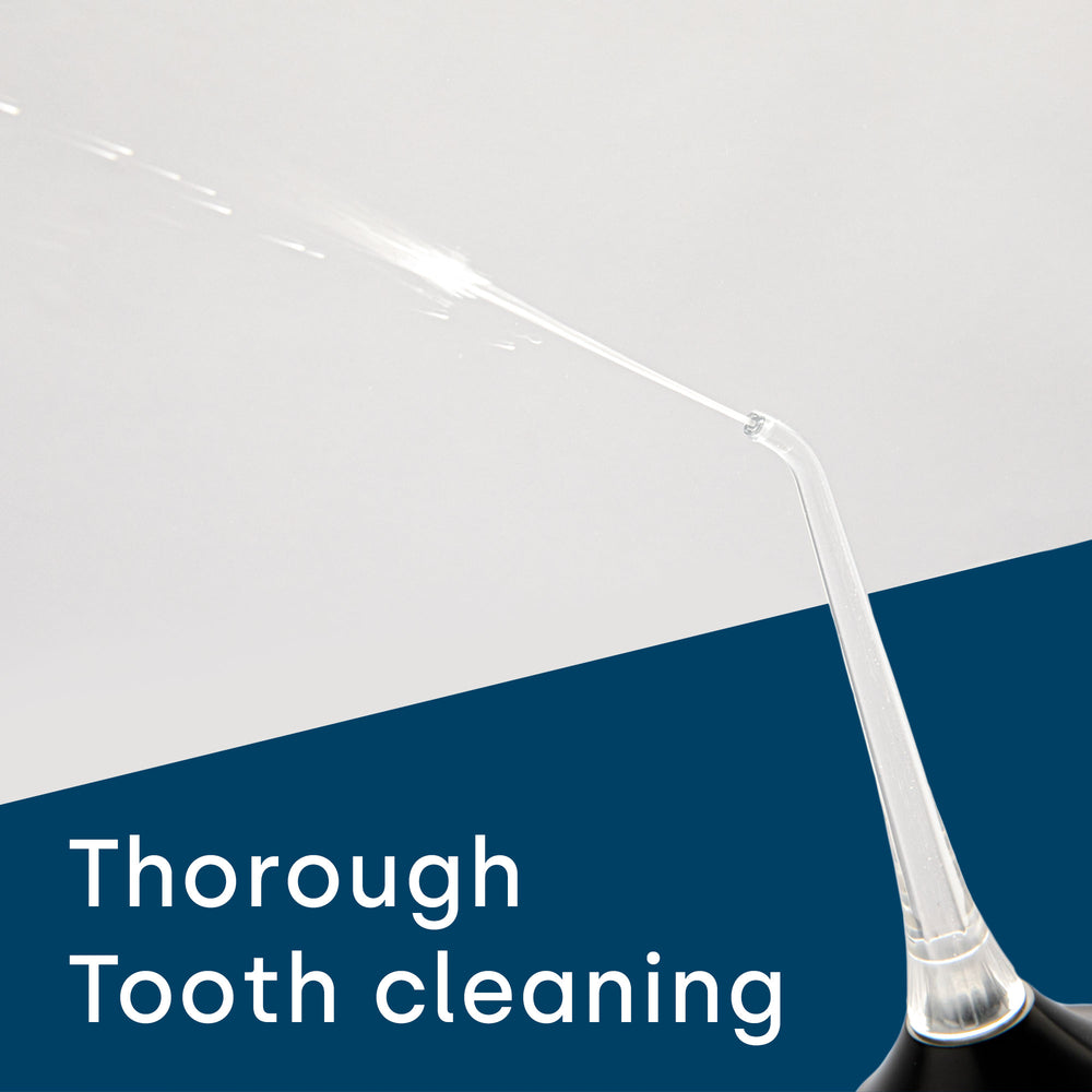 Scientific studies have shown that simply brushing your teeth with a toothbrush is often not enough to achieve optimal oral hygiene. For this reason, we have designed an efficient and mobile oral irrigator that removes food residue and coarse deposits from even the hard-to-reach areas of the mouth. Thanks to the integrated battery, the device is cordless, ideal for on the go and therefore offers a significant advantage over a stationary oral irrigator. Our AQUADENT oral irrigator is an excellent alternative to conventional dental floss and contributes to healthy gums.