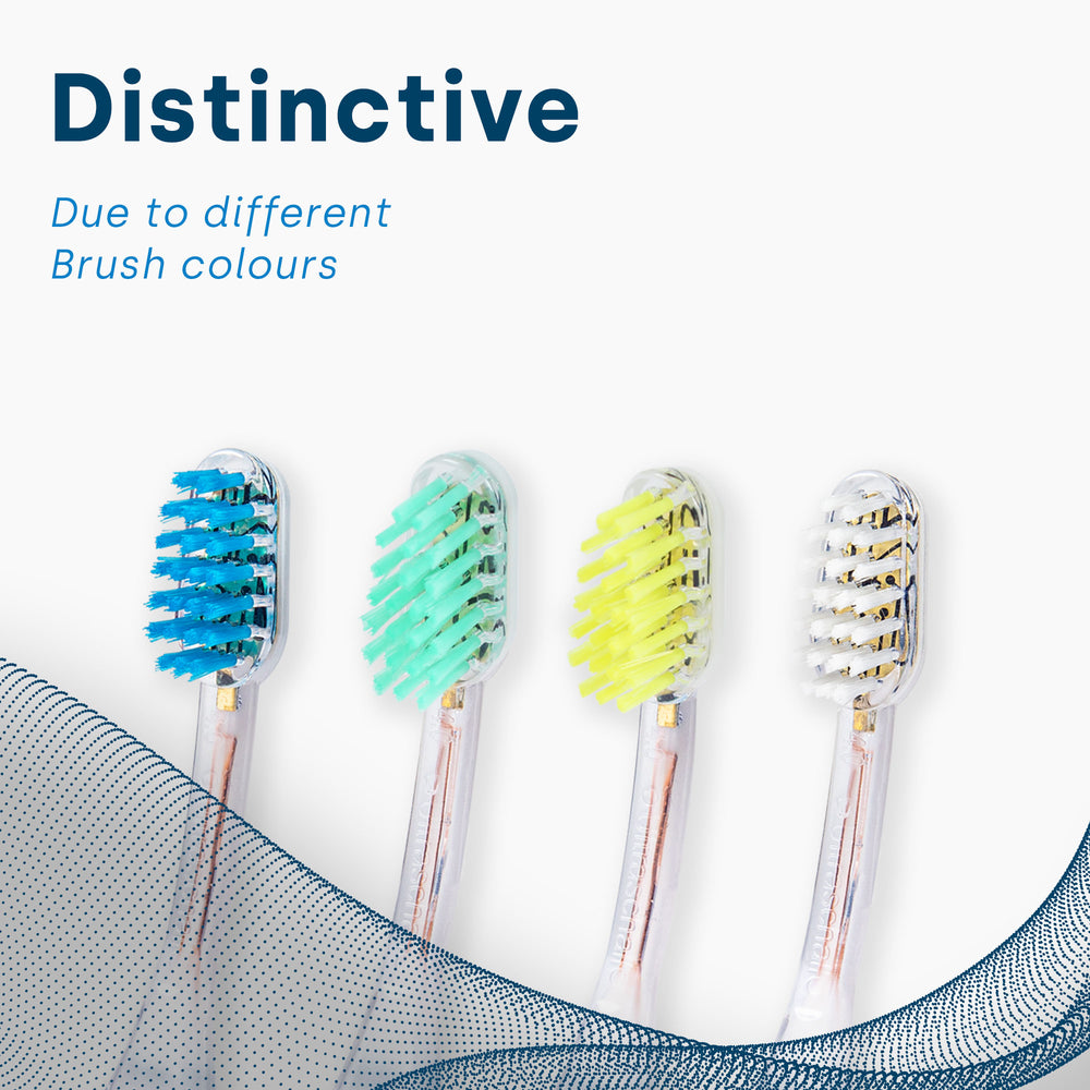 The ultrasonic brush head of the emmi-dent Ultrasonic toothbrushes contain a special, patented piezo chip (ultrasonic generator) in the brush head to generate the 100% original emmi-dent Ultrasound. In the sockets of the emmi-dent Platinum Ultrasonic brush heads have 4 contact pins for connection to the emmi-dent Platinum handpiece integrated. This innovation prevents jamming when plugging in and the ultrasonic brush head can be easily plugged in and removed. In addition, thanks to the optimized ultrasonic timing, these are up to 4 times more effective than the brush heads of the emmi-dent Metallic.