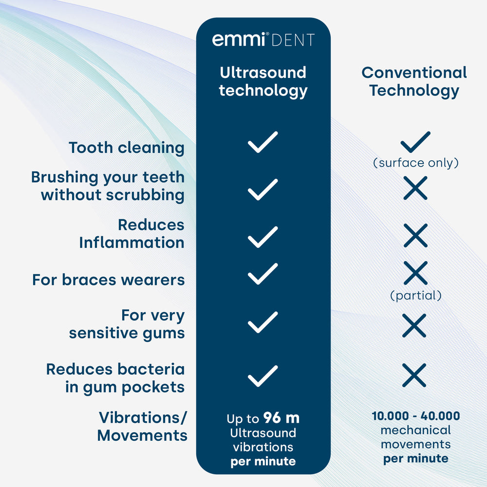 Ultrasound technology has proven itself in professional tooth cleaning at the dentist. It uses a "hard" ultrasound with a low frequency and high power. Dentists have been using the method successfully for many years to remove tartar and other contaminants. The ultrasonic toothbrush also enables daily use of ultrasonic technology at home. The innovative emmi-dent uses a "soft" ultrasound with a high frequency and low power.