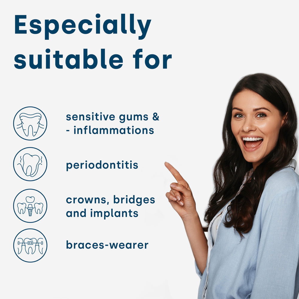 Ultrasound reduces bacteria, even in gum pockets, reduces bad breath, and reaches even hard-to-reach areas such as interdental spaces. This sustainably reduces bacteria, making it ideal for braces and implant wearers.