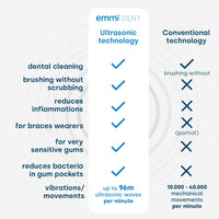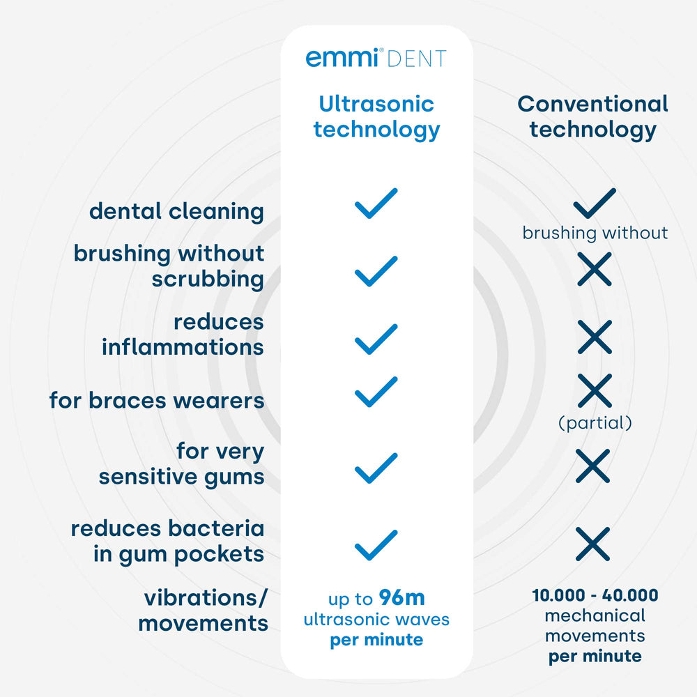 Ultrasound technology has proven itself in professional tooth cleaning at the dentist. It uses a "hard" ultrasound with a low frequency and high power. Dentists have been using the method successfully for many years to remove tartar and other contaminants. The ultrasonic toothbrush also enables daily use of ultrasonic technology at home. The innovative emmi-dent uses a "soft" ultrasound with a high frequency and low power.