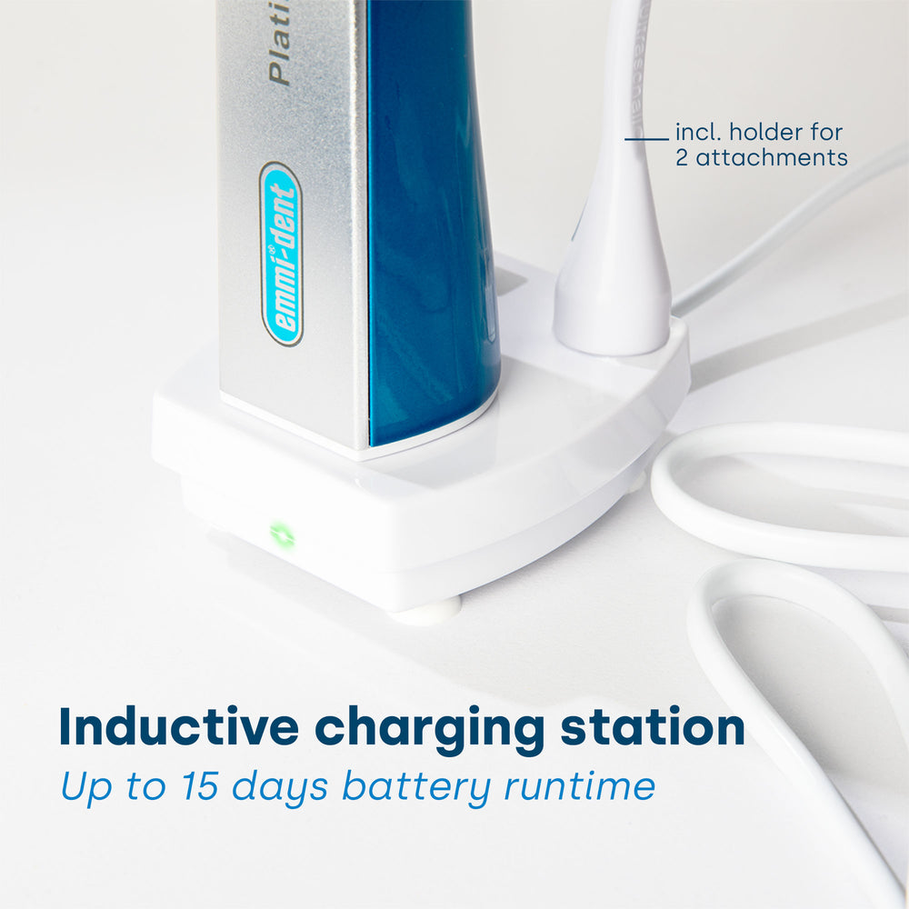 The emmi-dent Platinum Care has a longer battery life than its predecessor models. With regular use of 2-3 times a day, the Platinum Care can last up to 15 days before it needs to be recharged. This extended battery life (lithium-ion) offers convenience and uninterrupted use and eliminates the need for frequent charging.