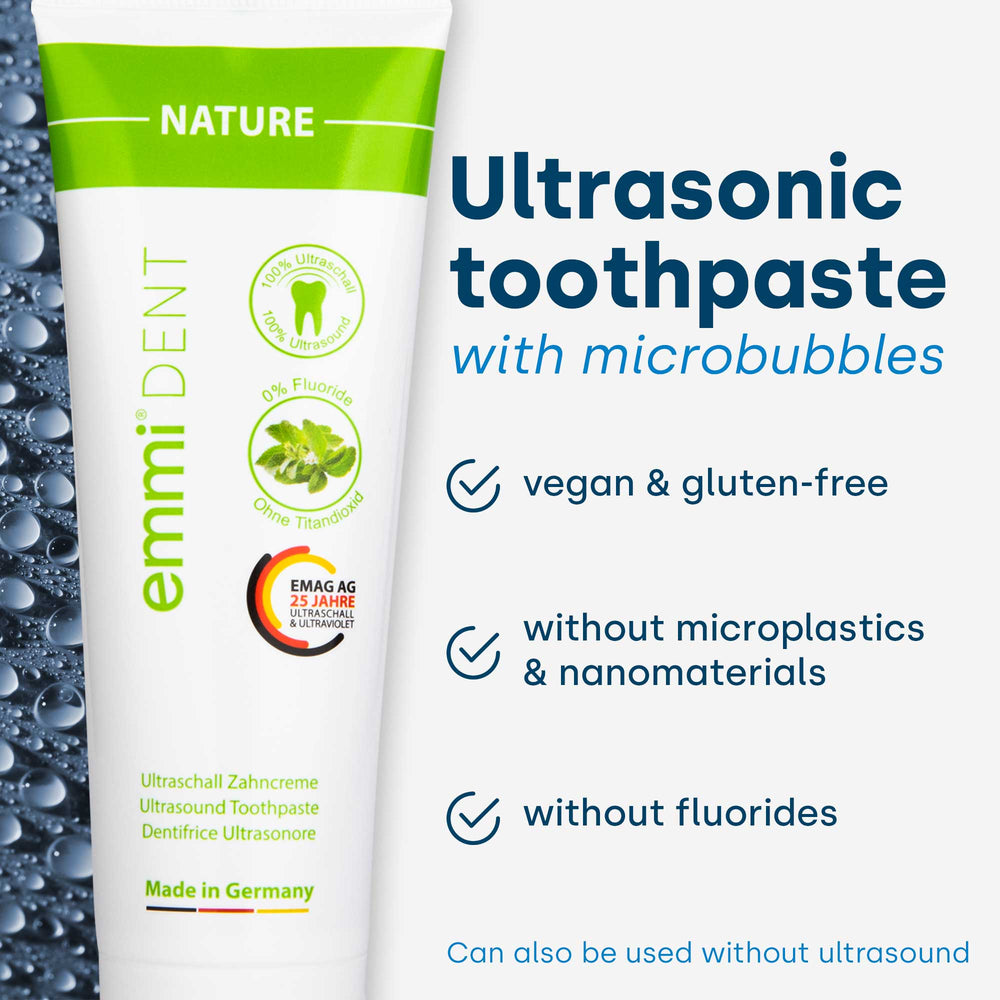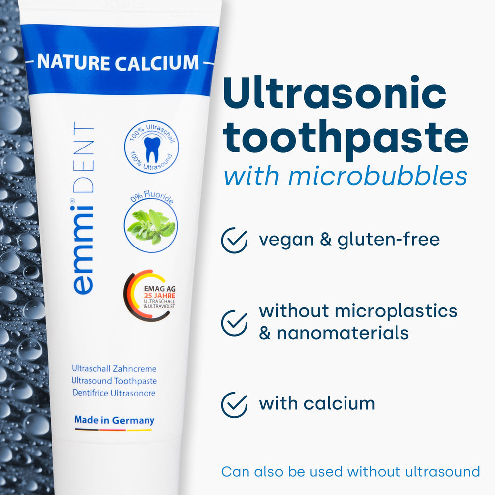 The emmi-dent Platinum uses a special ultrasonic toothpaste that contains the necessary microbubbles, which are about 1000 times smaller than typical toothpaste bubbles. These microbubbles are added in an extra step in the production process to ensure an optimal cleaning experience - find the study on its existence here. Consider the five different toothpaste options available for the emmi-dent and their respective benefits and properties.