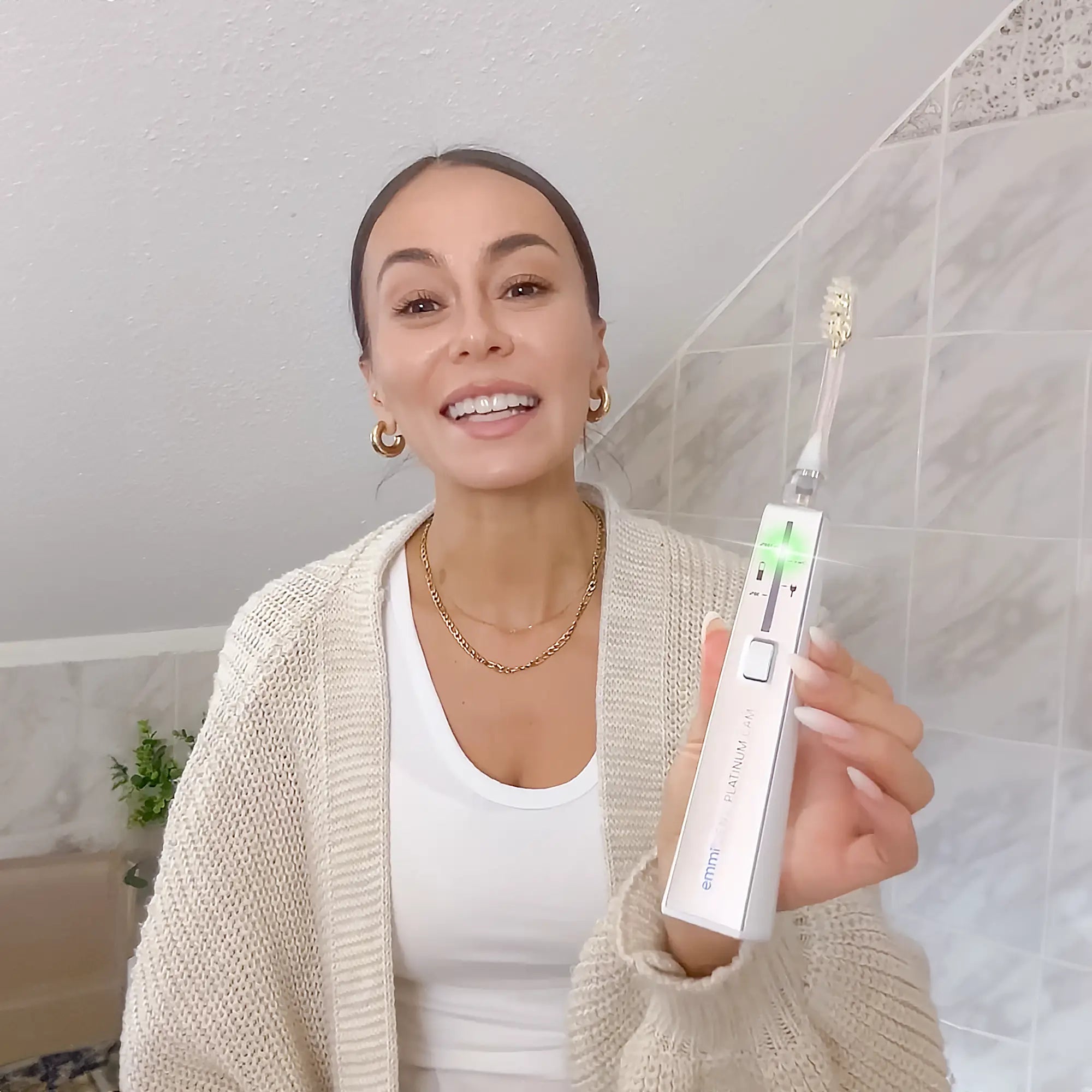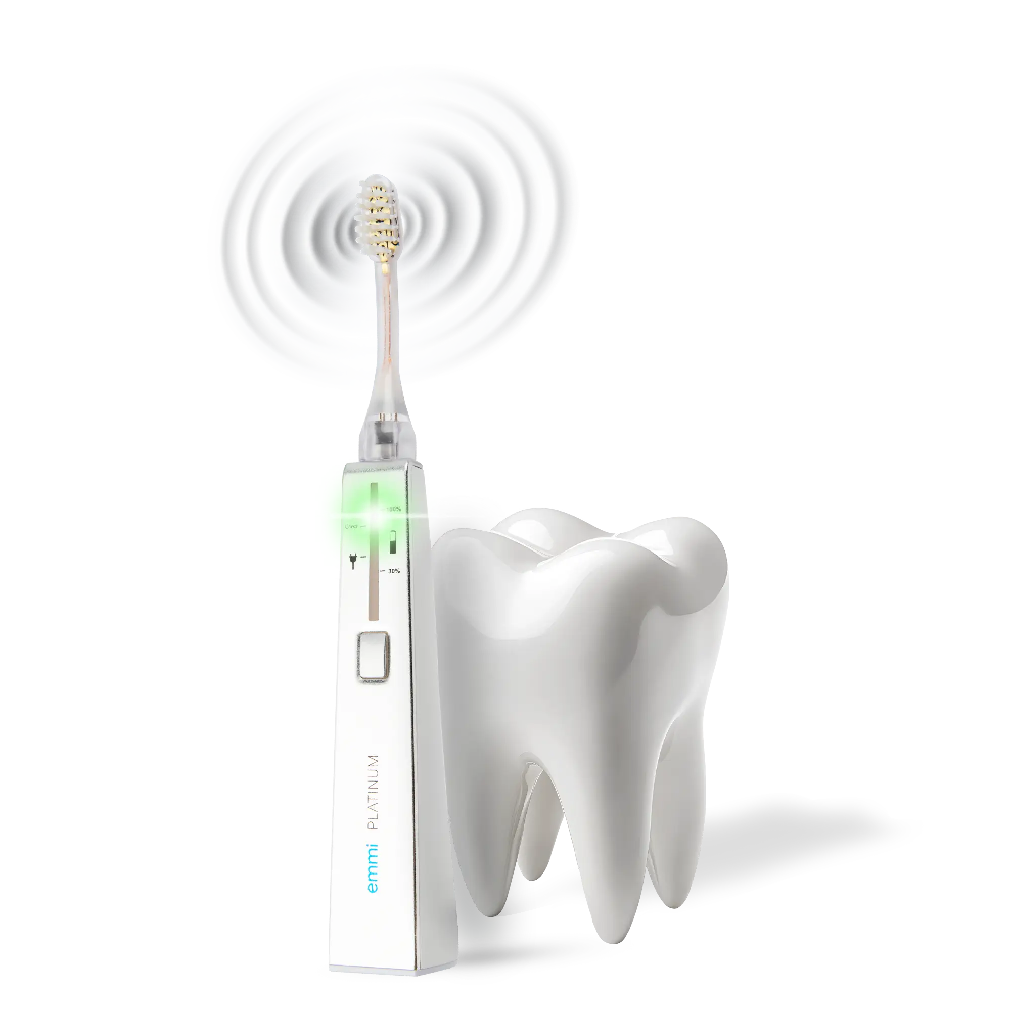 Ultrasonic toothbrushes are the pinnacle of innovation in dental care, offering cleaning performance that goes far beyond what is possible with traditional electric toothbrushes. When choosing the best ultrasonic toothbrush, you should pay attention to factors that affect both cleaning efficiency and ease of use. Our emmi-dent Platinum ultrasonic toothbrush is at the forefront of this technological revolution and meets all the criteria for an excellent ultrasonic toothbrush: 100% ultrasonic: Unlike sonic toothbrushes that are based on mechanical movements, our emmi-dent Platinum works with pure ultrasonic vibrations - up to 96 million vibrations per minute. This high frequency enables thorough cleaning without mechanical contact, which minimizes the risk of injury and delivers an unsurpassed cleaning result. Vibration can be switched off: The emmi-dent Platinum offers the option of switching off the vibration. This guarantees tailor-made care, be it for sensitive gums or for intensive plaque removal - and all without scrubbing and vibration! Long battery life: With a battery life of up to 15 days when used twice a day, our ultrasonic toothbrush sets new standards in terms of endurance and eliminates the need for frequent charging. High-quality workmanship: The emmi-dent Platinum features a powerful motor and a waterproof housing, which ensures long-lasting and reliable use. Diverse brush heads: To match our ultrasonic toothbrush, we offer a selection of brush heads designed for different applications and user needs to enable individual and effective cleaning. The emmi-dent Platinum stands out from other ultrasonic toothbrushes with its advanced technology and user orientation. So if you are looking for the best ultrasonic toothbrush, the emmi-dent Platinum offers you a combination of effective cleaning, comfort and advanced technology that ensures maximum cleaning performance and oral hygiene when brushing your teeth!