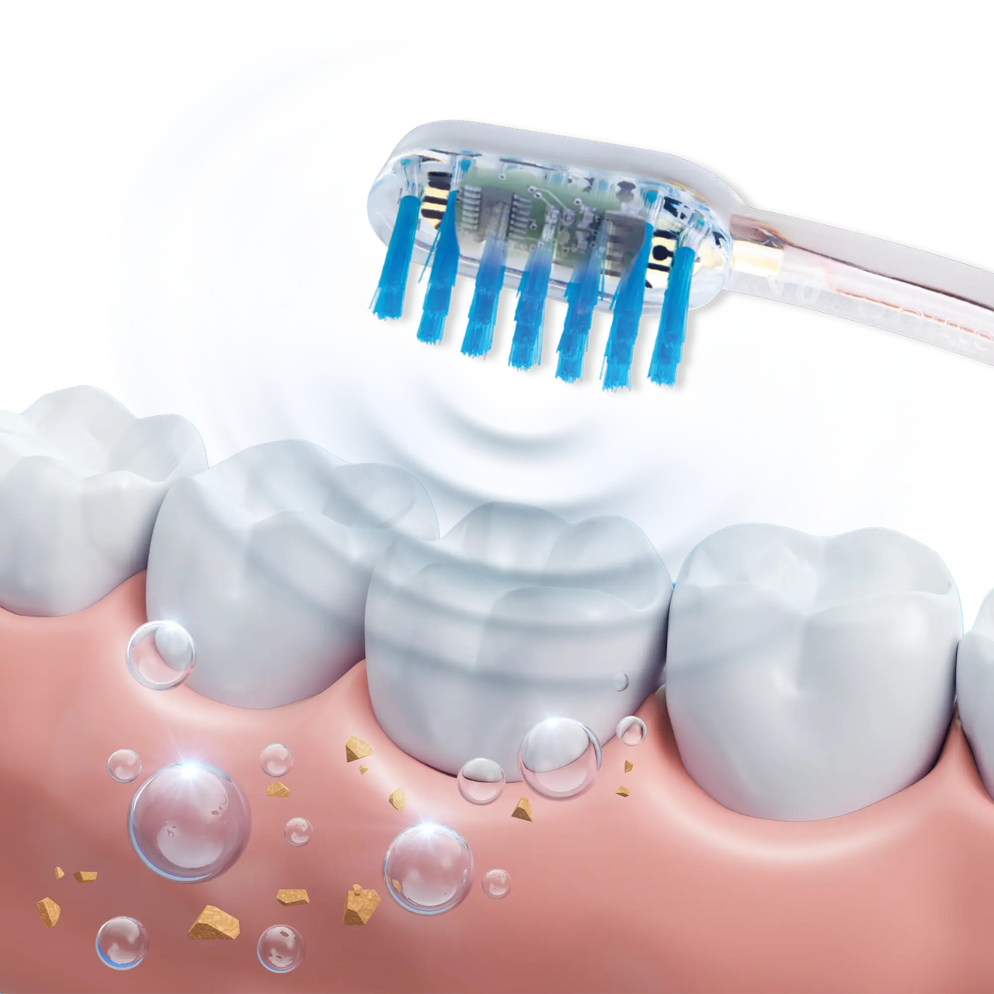 The fine ultrasonic vibrations penetrate deep into the spaces between the teeth and the gums, removing bacteria even in hard-to-reach places and thus effectively preventing tooth decay, plaque and gum inflammation. Regular use can actively reduce the development of gingivitis and periodontitis.