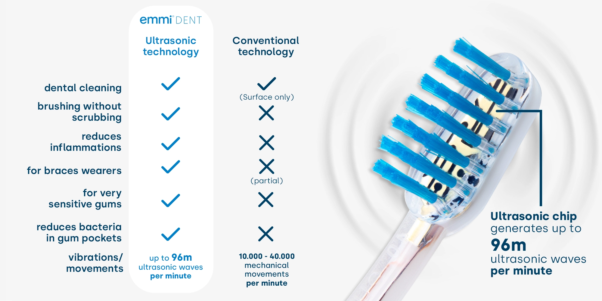 The key difference to other toothbrushes lies in the type of cleaning: While electric rotary and sonic toothbrushes work mechanically and therefore only clean the areas that they physically reach, the ultrasonic toothbrush from emmi-dent offers a comprehensive cleaning of the entire oral cavity. And this happens without any pressure, which enables gentle and thorough care - gentle on the gums and suitable for sensitive teeth.